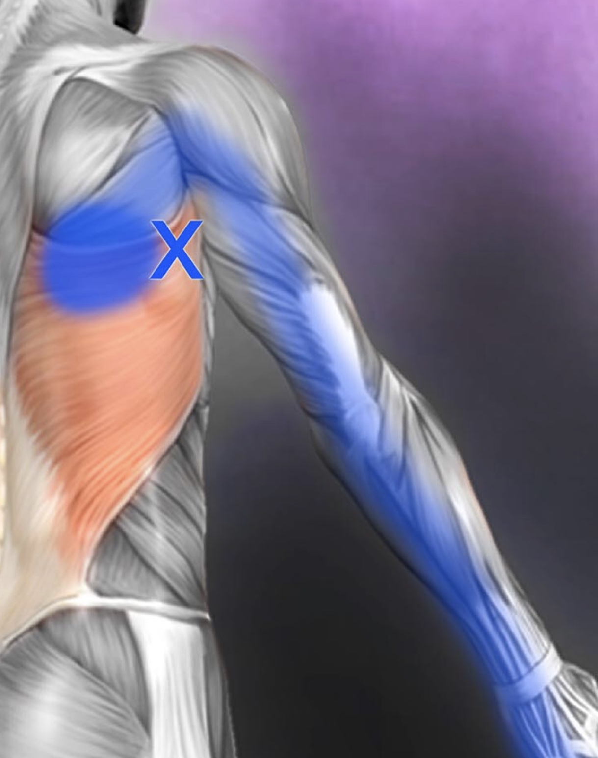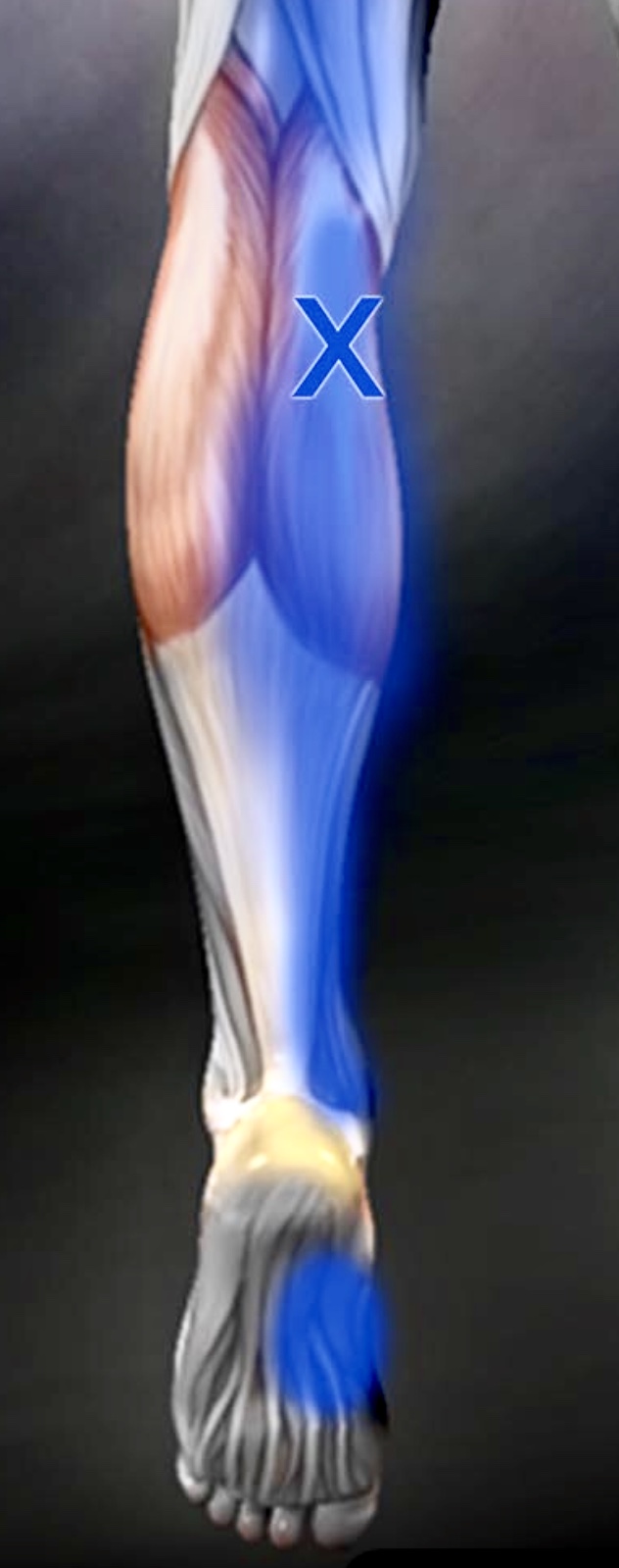 The next problem is the Trigger Point Pain Patterns. Trigger Points often have very specific pain patterns. Look at these three examples (Muscle Trigger Points, Real Bodywork app) and notice that the “x”, the trigger point, and that the blue highlighted pain pattern is AND is not in the same area