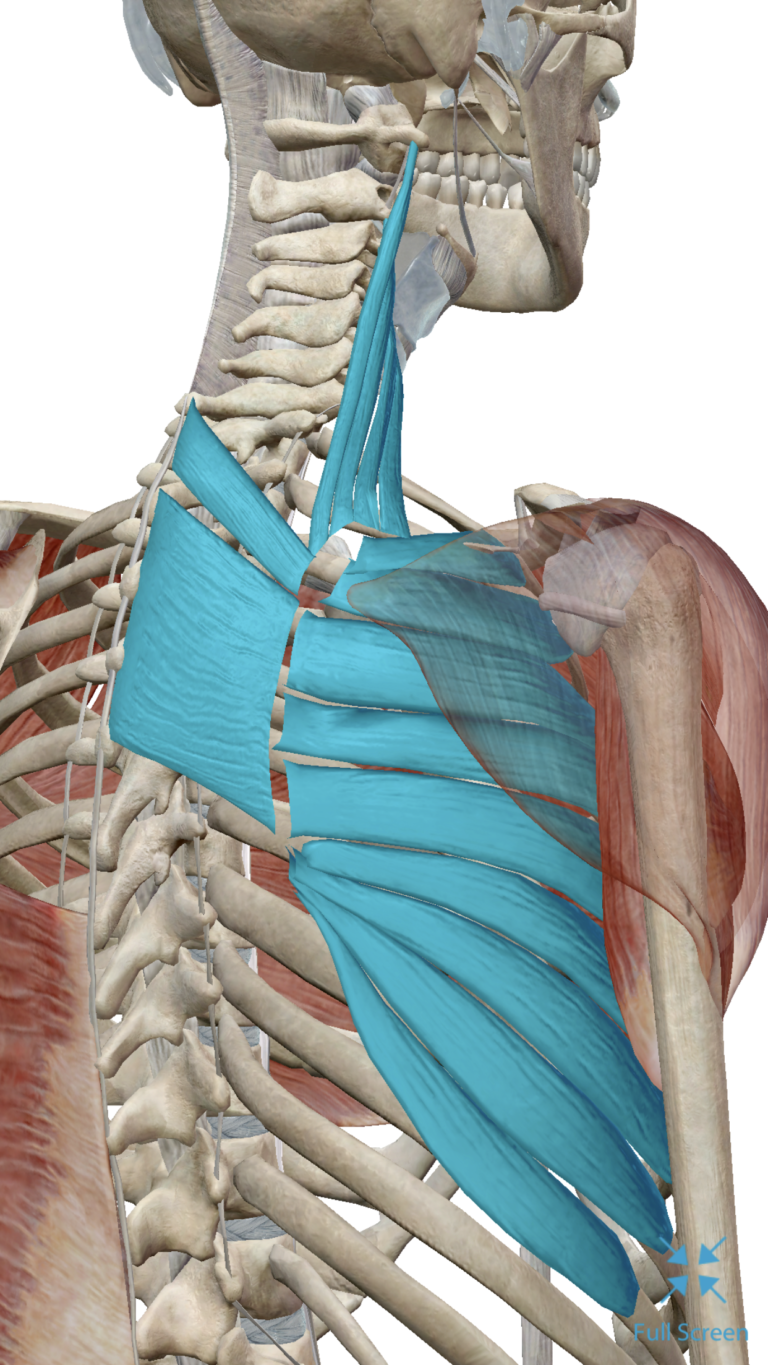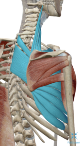 Levator Scapulae goes up the neck to the base of the skull, the Rhomboid Complex between the shoulder blade and spine and finally the Serratus Anterior that runs under the shoulder blade and attaches to the rib cage. The Serratus Anterior dwarfs the other two in size.